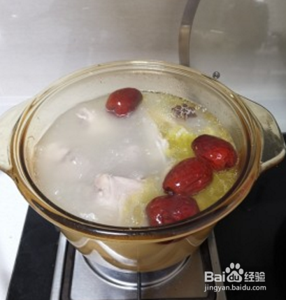 至鸡肉炖熟后,加入洗好的大枣,加入适量盐,炖煮约半小时,然后再放入枸杞,再炖10分钟左右。