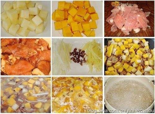 1土豆、北瓜切丁;肉切片放少许酱油稍稍腌渍;葱姜切丝