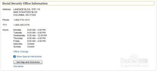 系统就会出现提示距离您住址最近的SSA办公大厅及办公时间,在点击Get Map And Directions网页会自动出现地图位置。