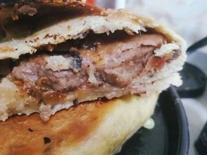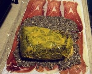 将大蒜,口蘑,洋葱切末,放入刚才煎牛排的底油中,煸干水分,加入少量酱油调味,平铺帕尔马火腿,再抹上蘑菇酱,再放上牛排,卷起来
