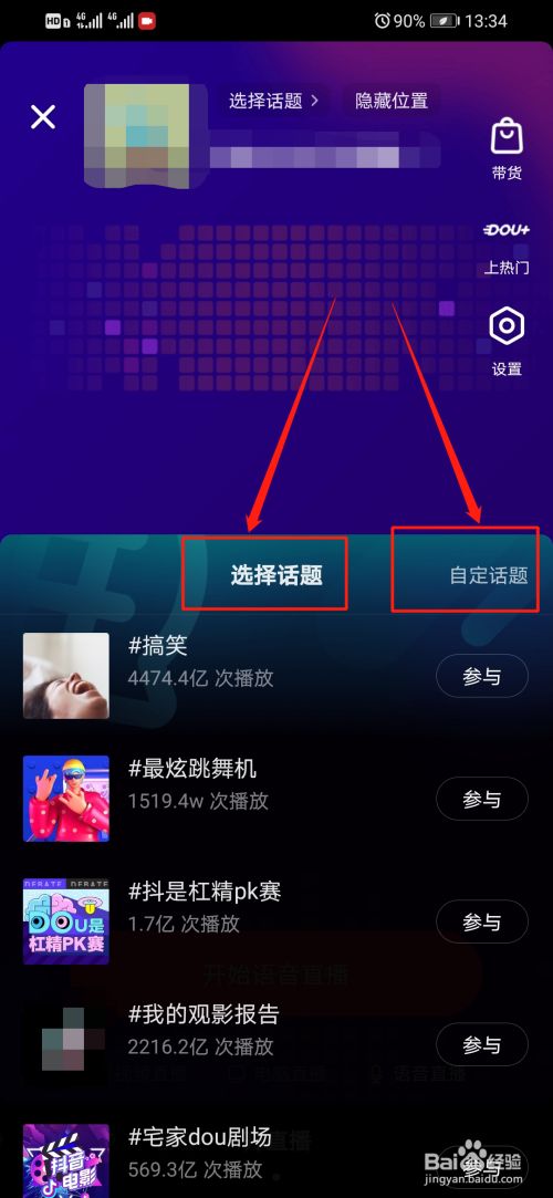 点击页面顶部的【选择话题】或者【自定义话题】,设置直播话题。