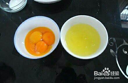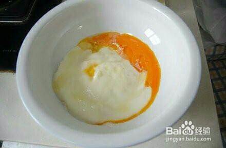 接着,在蛋黄中加入酸奶、食用油、白砂糖搅拌均匀,再加入面粉搅拌成无颗粒的蛋液