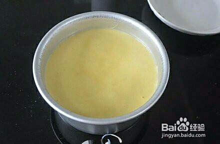 把搅拌好的蛋糊倒入模具,震几下,震出泡沫