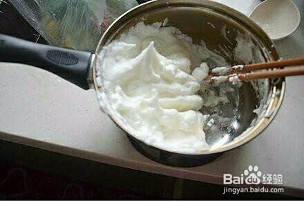 继续打成细腻的泡沫后,第二次加白砂糖;