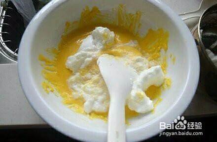把打发好的蛋白分三次以切半的方式和蛋黄混合均匀