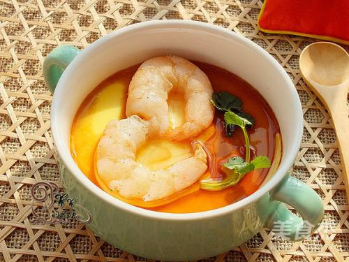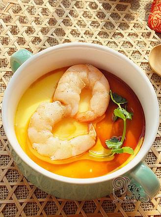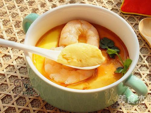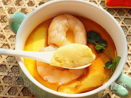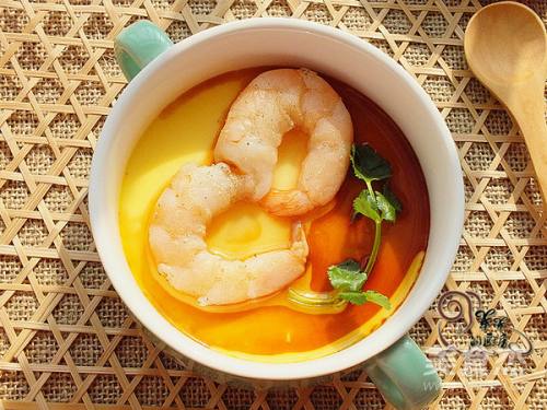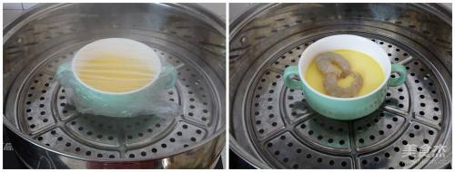 4锅内加水烧开,将蒸碗放入蒸屉,盖盖,小火蒸15分钟,一定不能大火,否则很快就会有马蜂窝,(蒸的时间要根据蛋液的多少调节,中途可以打开盖子轻轻晃一下小碗,如果凝固了就表示熟了)待蛋液基本凝固时,把虾仁放在上面,摆成一个心形,盖上保鲜膜继续小火蒸5分钟,虾仁熟透即可