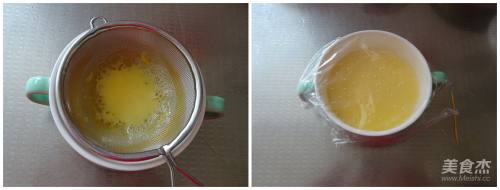 3用滤网过滤到蒸碗内,有气泡的话用牙签扎破,盖上耐高温保鲜膜,在保鲜膜上扎一些小孔,盖保鲜膜是为了防止水蒸气滴入碗内,这也是蛋羹滑嫩无气孔的关键