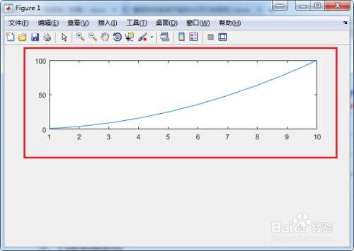 第二步在命令行窗口中按回车键,可以看到已经显示出一条曲线,横轴坐标范围1-10,纵轴坐标范围0-100,如下图所示: