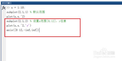 第三步我们通过plot(x,x.^2,'r')来绘制一条红色曲线,axis([0 12,-inf,inf])设置坐标轴的范围,这里设置横坐标轴0-12,纵坐标不变化,如下图所示: