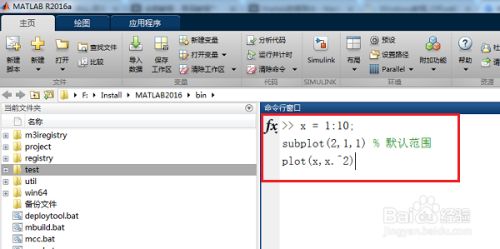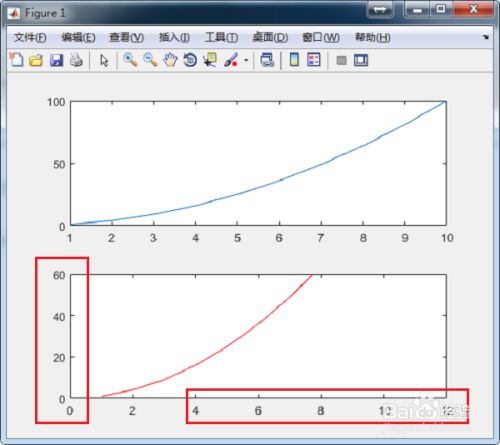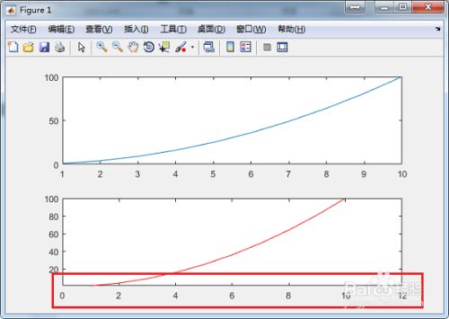 第一步在我们的电脑上打开matlab,通过plot(x,x.^2)绘制了一条平方曲线,subplot(2,1,1)代表界面中显示两张图,纵向排列,第一组显示,如下图所示:
