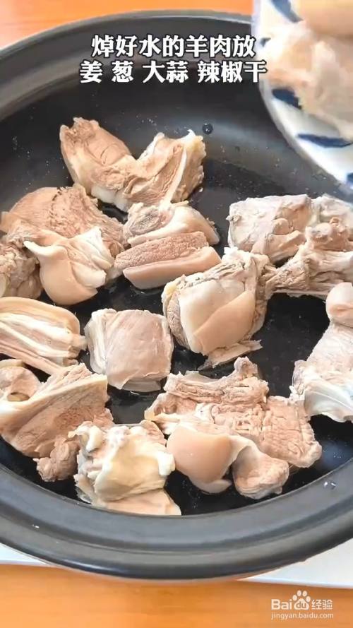 第一个步骤是砂锅中放入焯好水的羊肉块。再放入姜葱,大蒜,辣椒干