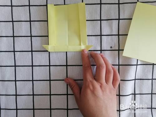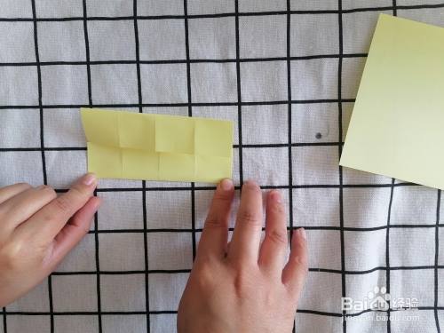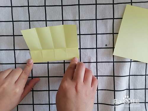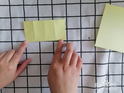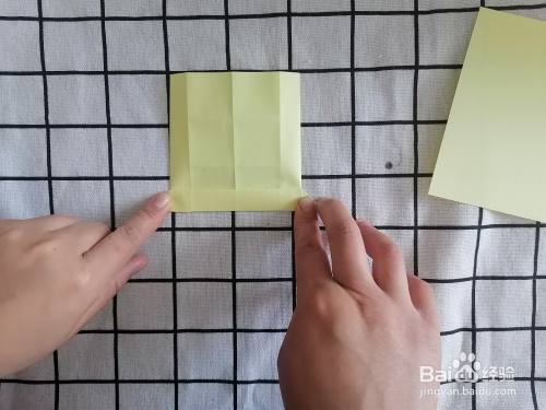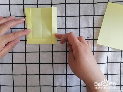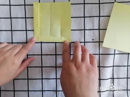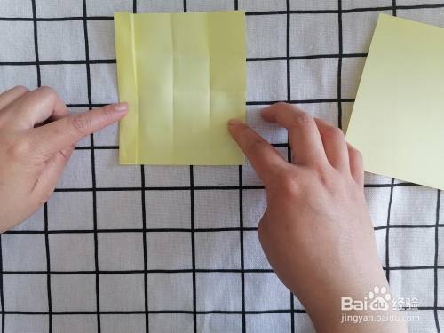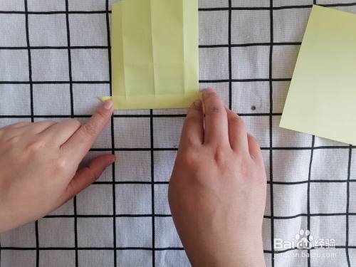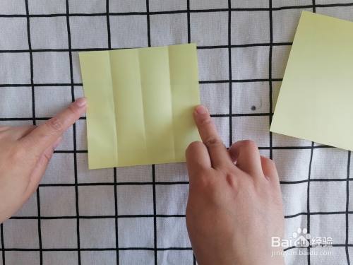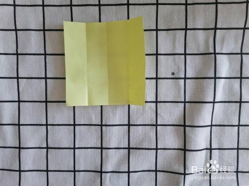 正方形彩纸边对边对折,两边再向中间折痕对折,如图所示。