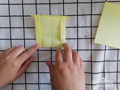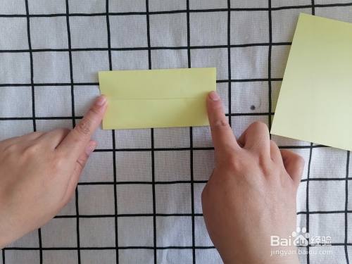 把纸翻转方向,再边对边对折,然后两边向中间折痕对折,如图所示。