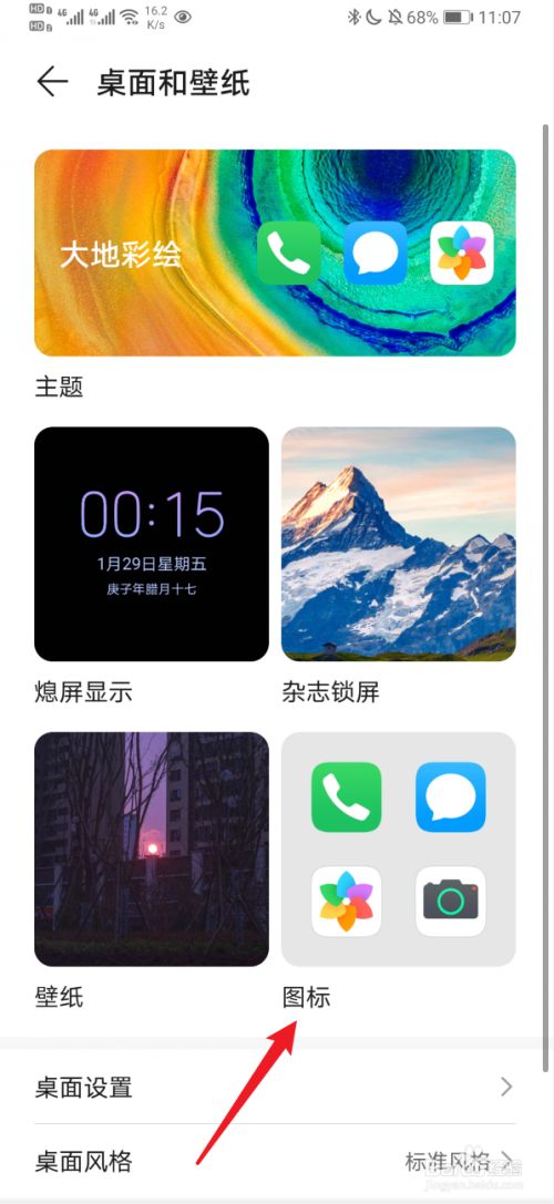2、在桌面和壁纸界面中,点击“图标”选项。
