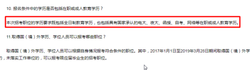 广东省公务员考试:据“2019年广东公务员考试报考指南”规定:除法官助理、检察官助理以及面向“退役大学生士兵”专门职位职位须为全日制普通高等院校学历外,其他职位的学历要求既包括全日制教育学历,也包括具有国家承认的电大、夜大、函授、自考、网络等在职或成人教育学历。