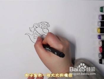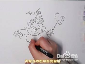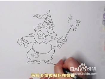 首先画出巫师的面部,眼睛圆圆的,鼻子大大的,胡子很长。