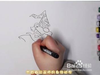 接着画出巫师的帽子,帽子很尖,有着很多的星星花纹。
