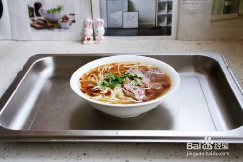然后把准备好所有食材混合在一起就可以了。骨汤中加入面条,上面撒上适量的香菜葱花,适量辣油,醋,一碗牛肉面就做好了