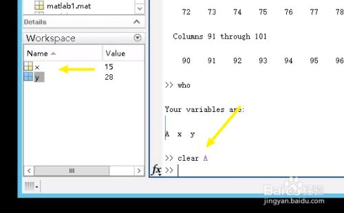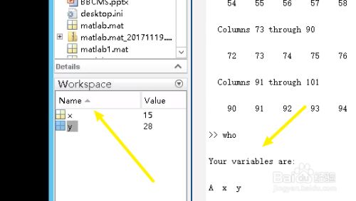 在左下角的工作区workspace中可以看到所有的变量,也可以使用who命令来查看所有变量。