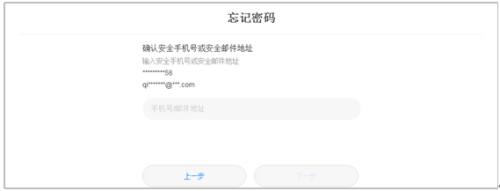 3.2 确认安全手机或安全邮箱地址:输入安全手机号或安全邮箱地址(若帐号没有开启帐号保护2.0,则无此步骤)