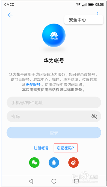 2、 在安全中心点击 “找回密码”,输入华为帐号和验证码。