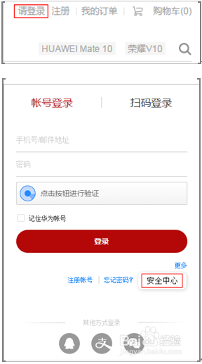 1、 进入网页端华为商城网站www.vmall.com,在页面右上角点击 请登录,在登录界面点击 更多- 安全中心,