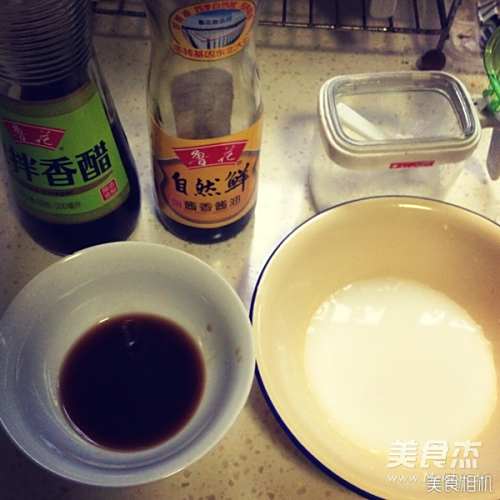 3在一个碗中倒入等量的醋和白糖,注意醋不用太多,否则会很酸,糖可以视个人口味多放些。再倒入少量生抽,用筷子搅拌均匀。另取一个碗,加水调少量淀粉待勾芡用