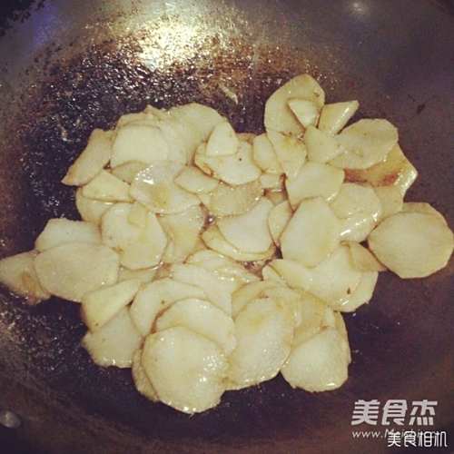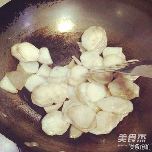 5放入山药片,翻炒,让山药都沾上油,然后放一小勺盐(就跟平时炒一盘菜一样分量的盐)