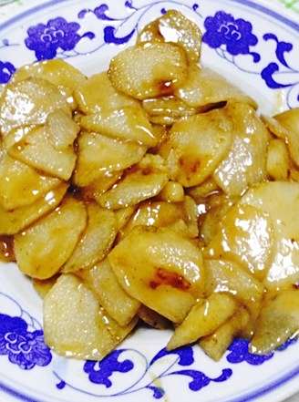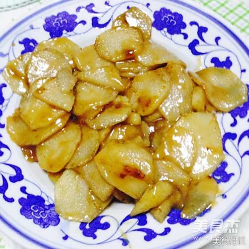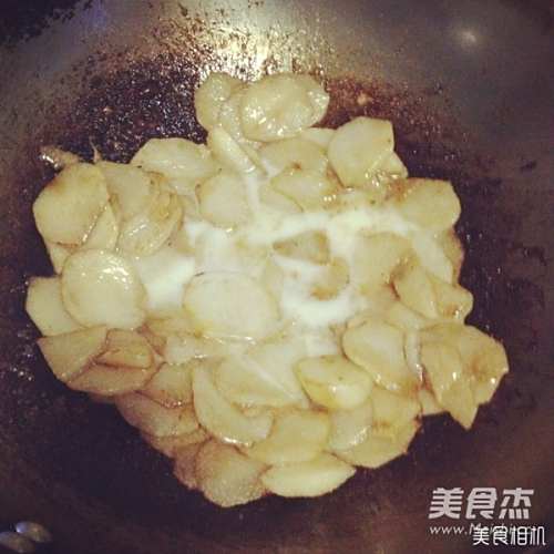 6中大火翻炒,直至山药片变得半透明,倒入事先调好的调料汁,如果有不少糖没化开沾在碗底,可以夹取几片山药放入碗中,用山药把糖蘸干净再放回锅中。翻炒均匀