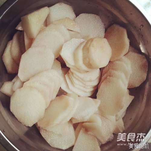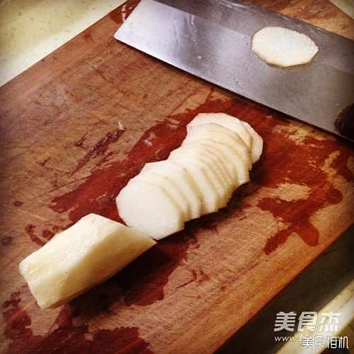 1洗净山药,去皮,斜切成片(注意,不要太厚也不要太薄,太厚不容易进味,太薄容易炒碎)