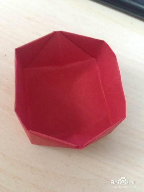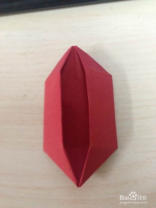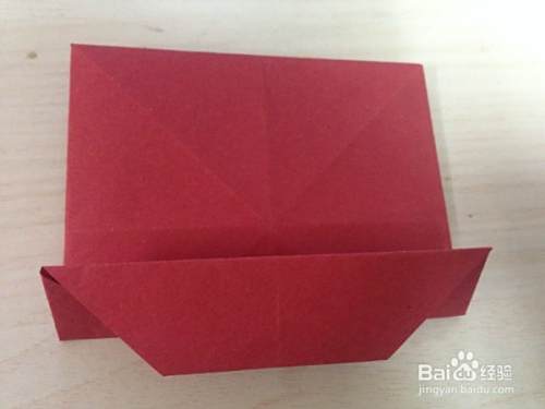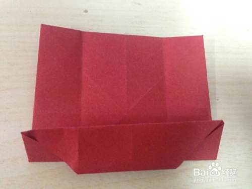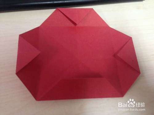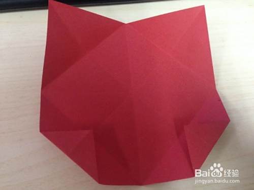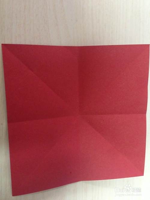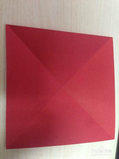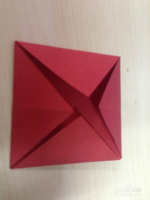 接下来,把纸展开,然后四个角向中间靠上的折线折叠,出现四个小三角形;