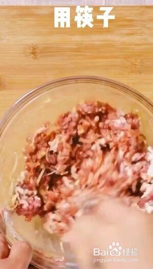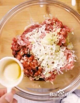 猪肉馅儿八百克,加入各种调料,葱姜末各10g,生抽15g,料酒10g,蚝油10g,鸡蛋一个和淀粉30g。