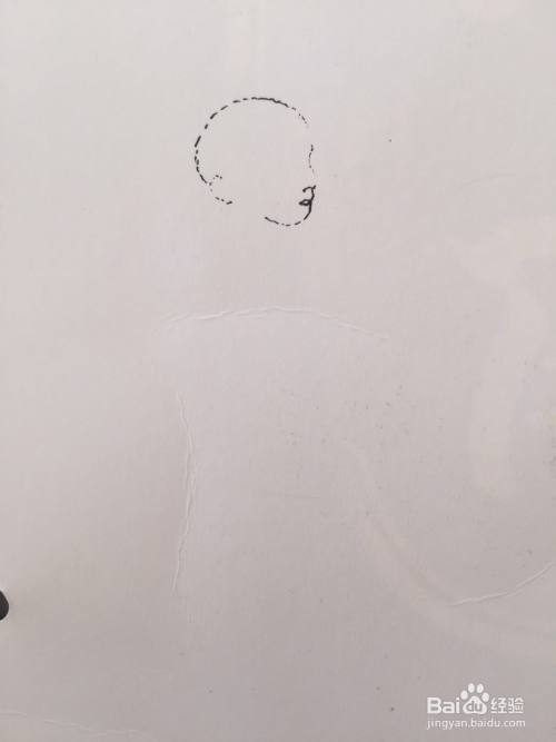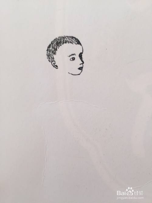 首先在白纸上,用黑色碳素笔画出人物的头部轮廓。我们在其头顶画出发型,在其面部画出五官。