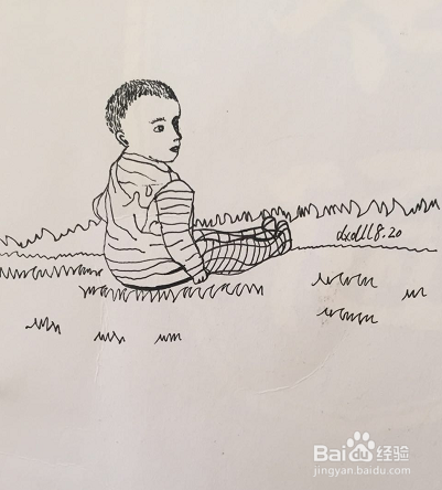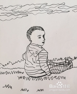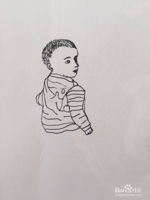 用笔画出男孩的服装,我们在服装上画出条纹图案作为装饰,用笔在服装袖口下方画出双手。
