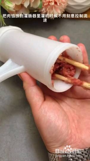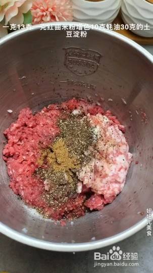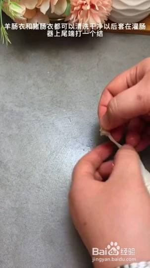 1克13香1克红曲粉10克蚝油30克土豆淀粉,最后放90毫升冰过的花椒水翻拌均匀,羊肠和猪场都可以,洗干净在灌肠器尾巴打一个结
