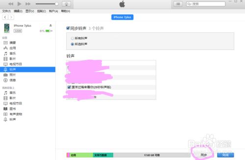 点击铃声选项 上面就会有刚刚添加的铃声了 点击右下角的同步 稍等几秒钟 打开手机的铃声选项 就会有这首歌 就可以作为铃声了 如果没有出现铃声选项 可以点击显示 然后点击媒体种类 勾选铃声 就会显示铃声选项了