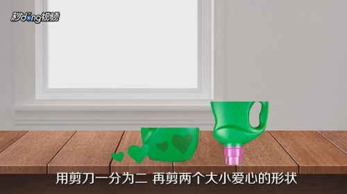 准备一个空的洗衣液瓶子,用剪刀一分为二,再剪两个大小爱心的形状。