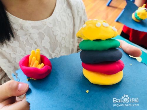 如图所是其实小朋友在制作汉堡包的过程中,他会发现汉堡包呢旁边还会放着薯条,可乐登的,所以他们在利用粘土制作汉堡包的同时也会加上一些他们生活中所已有的经验。
