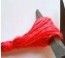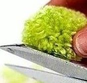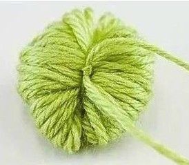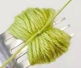 将毛线缠绕在叉子上,较短毛线绕住叉子上毛线后打结,取出毛线,在毛线边缘剪开,修理成球状。可以做装饰。