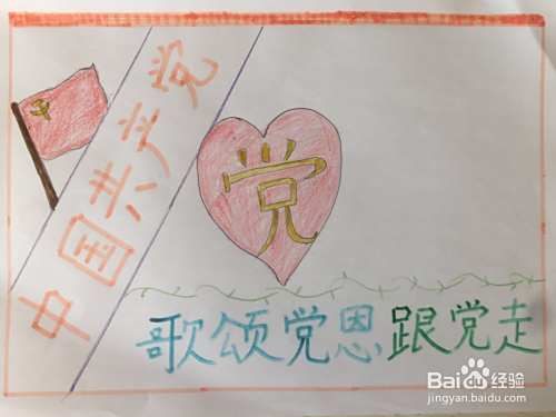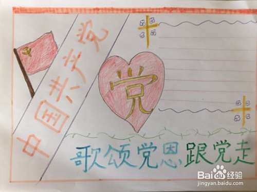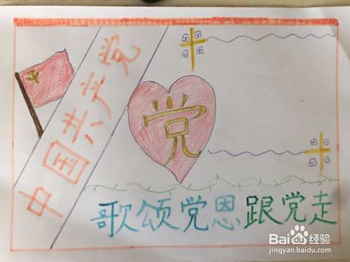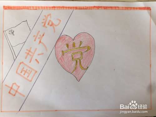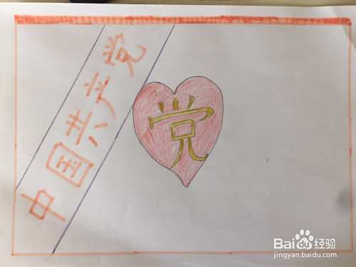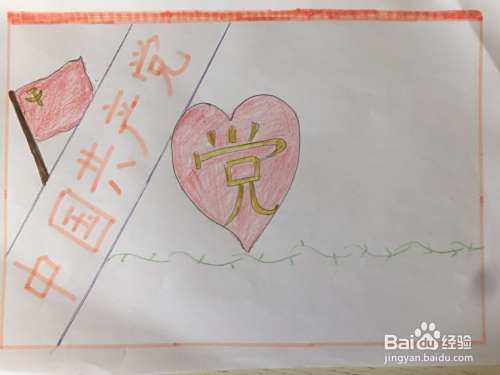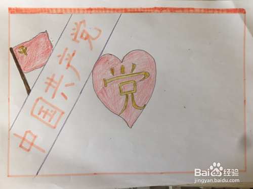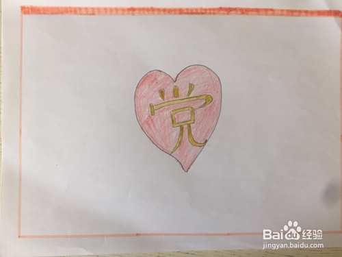 然后如图所示在白纸的正中央画一颗心,里面写上党,然后再给它们涂上适当的颜色,表示心中有党。