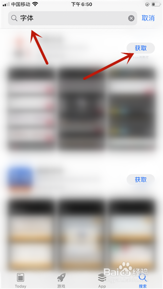5、在里面输入字体进行搜索,选择一个字体工具,点击【获取】等待下载完成。