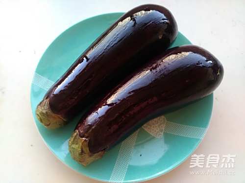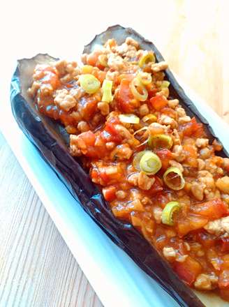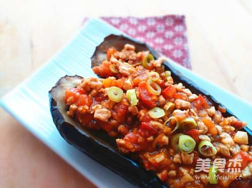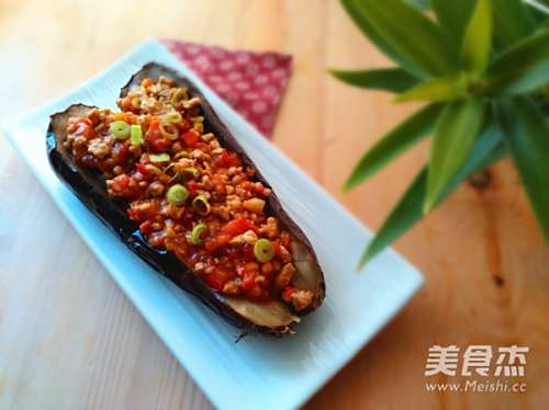 茄子剖开,不剖断,装上肉末就可以装盘了