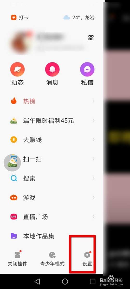 进入快手主页以后的是右上角三条横,弹出来的页面,点击右下角的设置。
