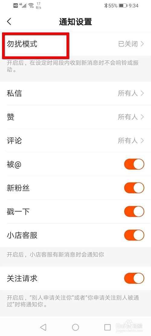 将里面的勿扰模式右侧的开关打开。