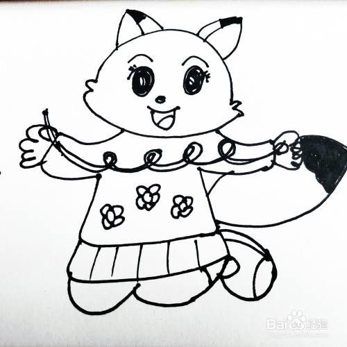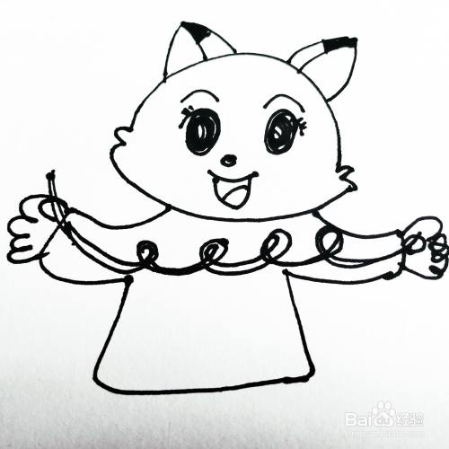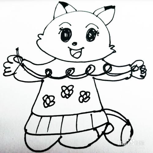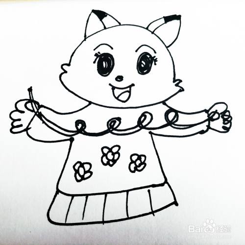 第六步,我们来画卡通猫咪的身体花朵还有小裙子。