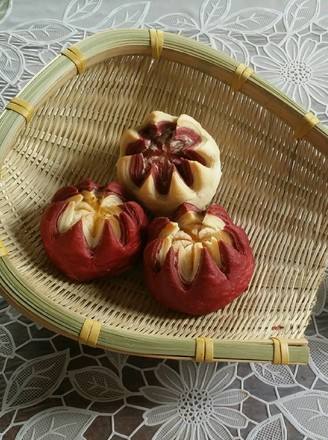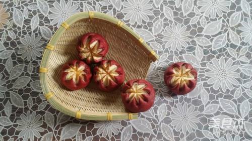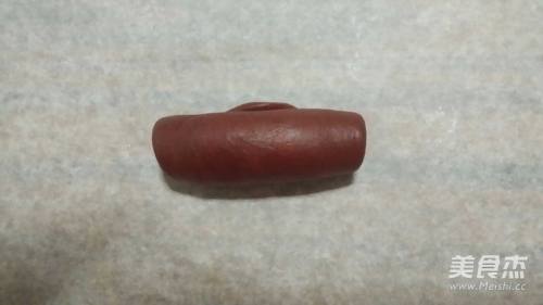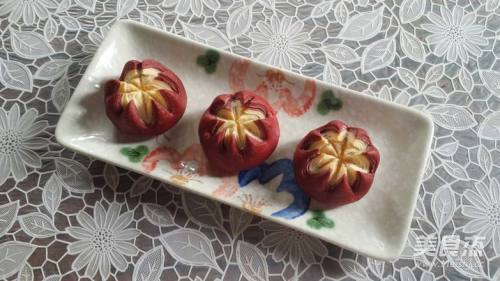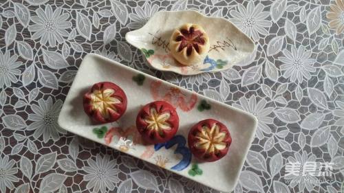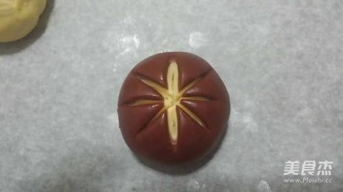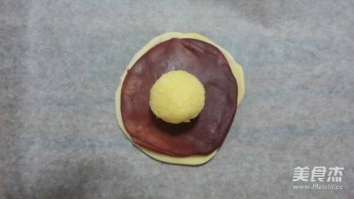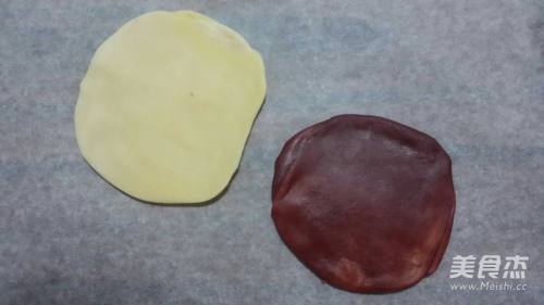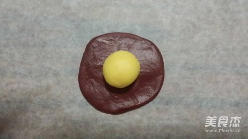 15将擀好的白色面皮和红色面皮相叠,放上搓好的内馅。