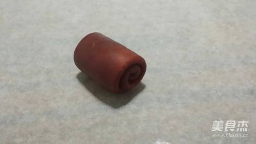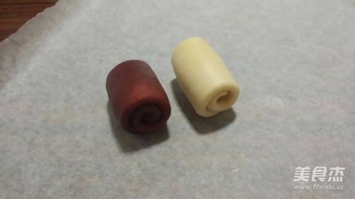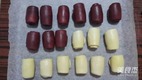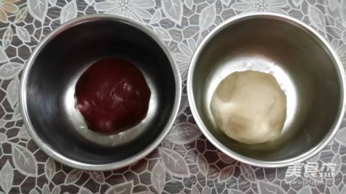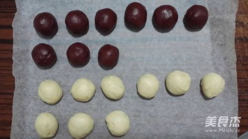 3把醒好的红曲水油皮平均分成9份,白色水油皮也平均分成9份。