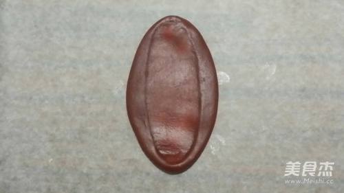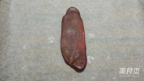 6取一个小面团,用掌心压扁,再擀成牛舌形状。