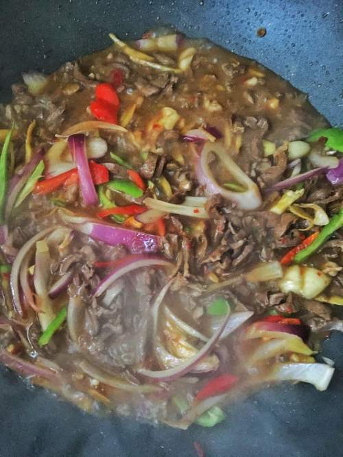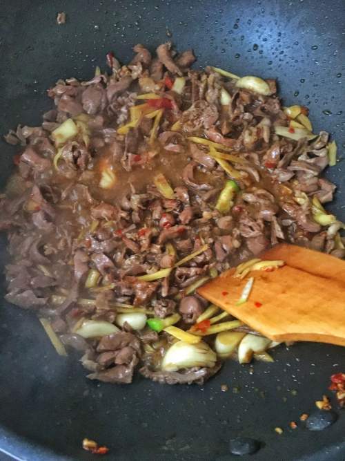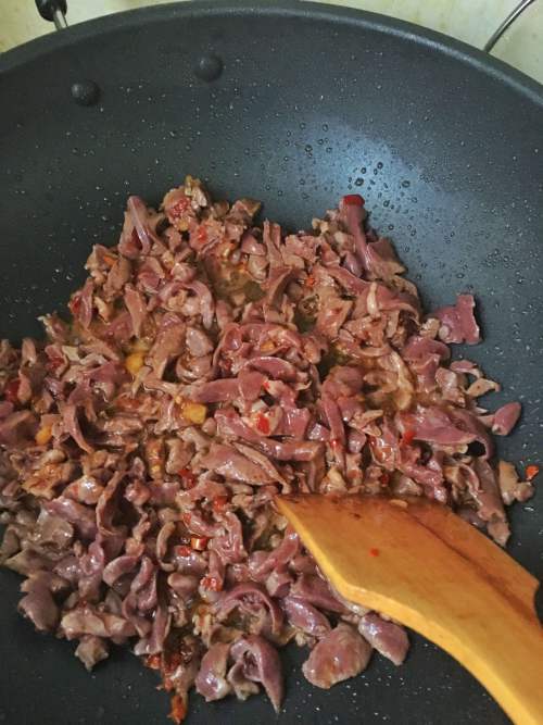 5倒猪心,放白酒、酱油少许爆炒。