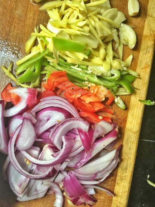 2姜蒜、洋葱、辣椒切好备用。